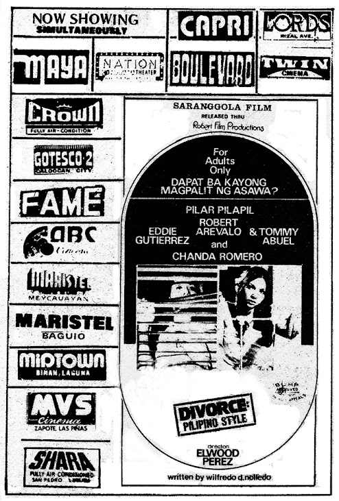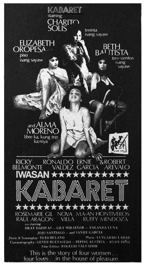 A Goldoni style comedy that revolves around poverty-stricken girl (Trixia Gomez), who joins the cabaret (a dance hall with taxi dancers) to survive and to support her younger sister (Andrea Bautista, the producer’s daughter) and brother (the child Bong Revilla, an action superstar and current Philippine Senator). This movie launched the movie careers of Gomez and Rico J. Puno, the current singing sensation. Vivian Velez was discovered and eventually became a major player in the industry as a producer and a star. Others in the cast are Marlon Ramirez, Anita Linda, Bella Flores, Angie Ferro, and Marissa Delgado. Presumed as a lost film until film buff and collector Jojo Devera found and partially restored the title in 2020. An anonymous donor who’s also a collector, gave Devera a DVD copy culled from U-matic tapes. The partially restored “Inday Garutay” is part of the PFA’s Elwood Perez Retrospective on the FDCP Channel.