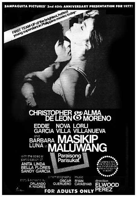 This 40th anniversary presentation was a smashing success at the box office. Christopher de Leon plays the sacrificing adopted son and Mat Ranillo III as the wayward real son of wealthy couple Anita Linda and Amado Cortez, are rivals over achievements and the love of a social-climber, Vilma Santos. All three were nominated for their performances, Mat Ranillo III won the FAMAS Best Supporting Actor award. Others in the cast are Lily Miraflor and Ma-an Hontiveros, in her big-screen debut. Its English-dubbed version, My Brother, My Wife, was entered in the Asia-Pacific International Film Festival in Taipei and the ASEAN Film Festival in Sydney, Australia.
