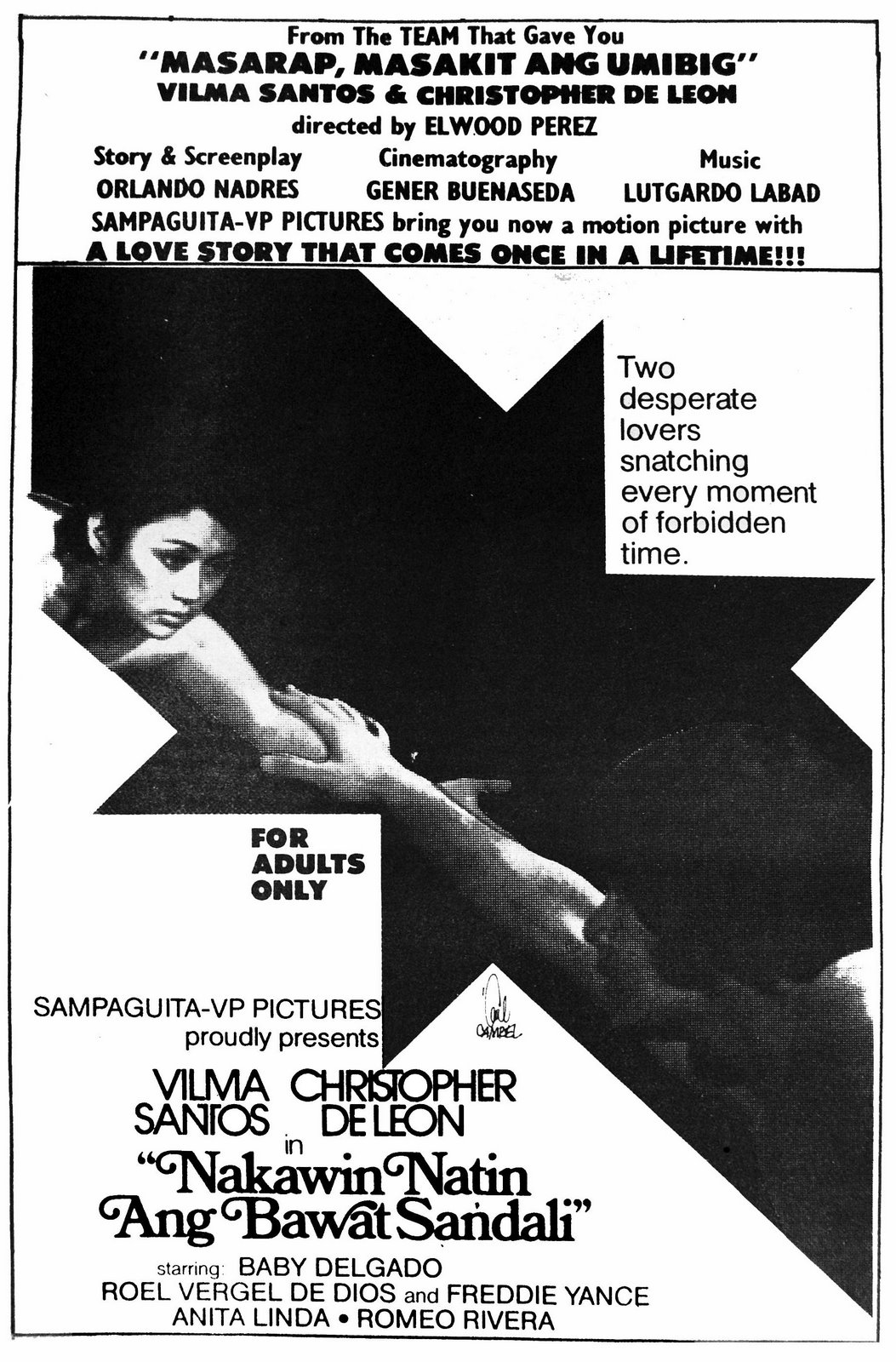 This box office hit stars Vilma Santos and Christopher de Leon whose young love affair is marred by family conflict coupled with pressure by small-town morals. After many years, they meet again in the city as successful career people, only to be drawn into another scandalous liaison. Despite all pressures, social, economic and otherwise, they throw all caution to the wind. Baby Delgado (Mutya ng Pilipinas title holder) debuts as the spoiled daughter of Tony Carrion, the boss. She hooks de Leon with a promise of career promotion. The film also stars Anita Linda, Romeo Rivera and Mario Escudero.