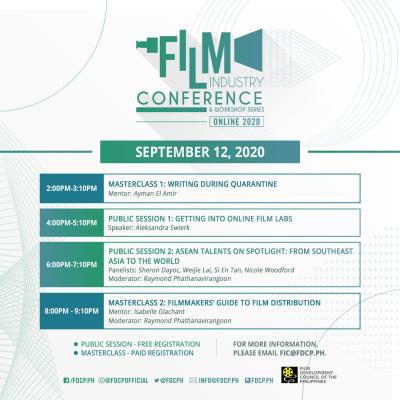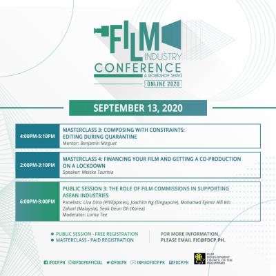 Special Events Special Events Session 5: An Exclusive Session with Netflix: Showcasing The Best of Filipino Content September 14, 2020 (Monday) 6:00PM-7:10PM Masterclass 5: Pitching Your Project Virtually September 14, 2020 (Monday) 4:00PM-5:10PM Session 4: Packaging an Animation Project for the International Market + Case Study September 14, 2020 (Monday) 2:00PM-3:10PM Session 3: The Role of Film Commissions in Supporting ASEAN Industries September 13, 2020 (Sunday) 6:00PM-8:00PM Masterclass 4: Financing Your Film and Getting a Co-Production on a Lockdown September 13, 2020 (Sunday) 4:00PM-5:10PM Masterclass 3: Composing with Constraints: Editing During Quarantine September 13, 2020 (Sunday) 2:00PM-3:10PM Masterclass 2: Filmmakers’ Guide to Film Distribution September 12, 2020 (Saturday) 8:00PM - 9:10PM Session 2: ASEAN Talents On Spotlight: From Southeast Asia to the World September 12, 2020 (Saturday) 6:00-7:10PM View More